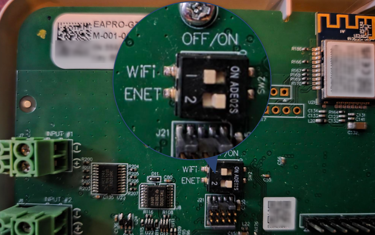 Located on the board (refer to image below) toggle to enable 1: Wi-Fi // 2: Ethernet (RJ45).