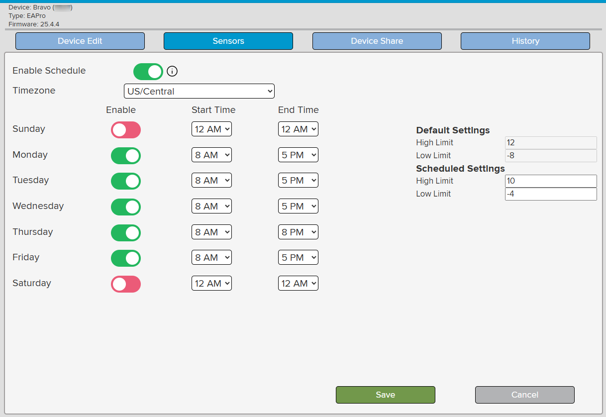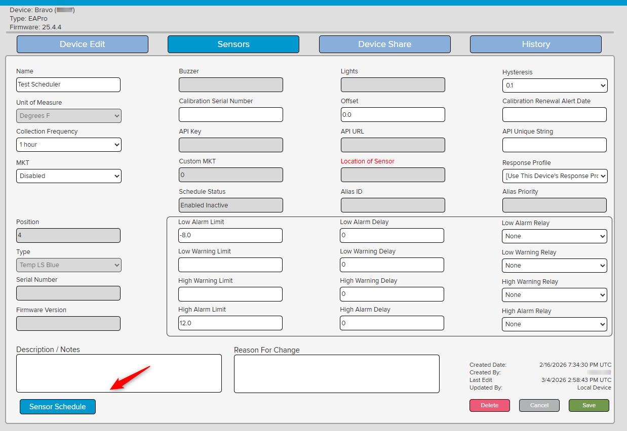 NOTE: The "Sensor Schedule" button may be grayed out if the system is pending an update from the device. This will adjust back to blue when the system is ready.